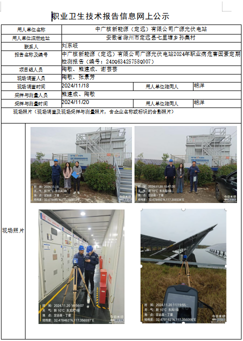 中廣核新能源(定遠(yuǎn))有限公司廣源光伏電站2024年職業(yè)病危害因素定期檢測(cè)報(bào)告(編號(hào):24DQ63425758Q007)